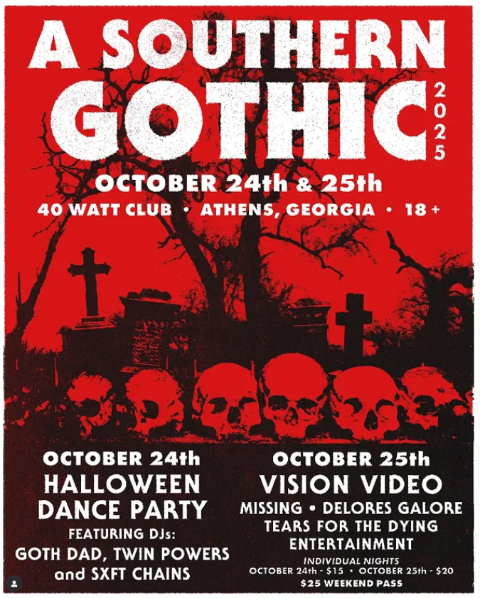 We are looking forward to this year’s Southern Gothic Festival kicking off Friday night, Oct 24 with a dance party with DJs Goth Dad, Twin Powers, and SXFT CHAINS. On Saturday Oct 25, live music with Vision Video, Missing, Delores Galore, Tears for the Dying and Entertainment